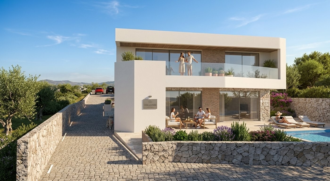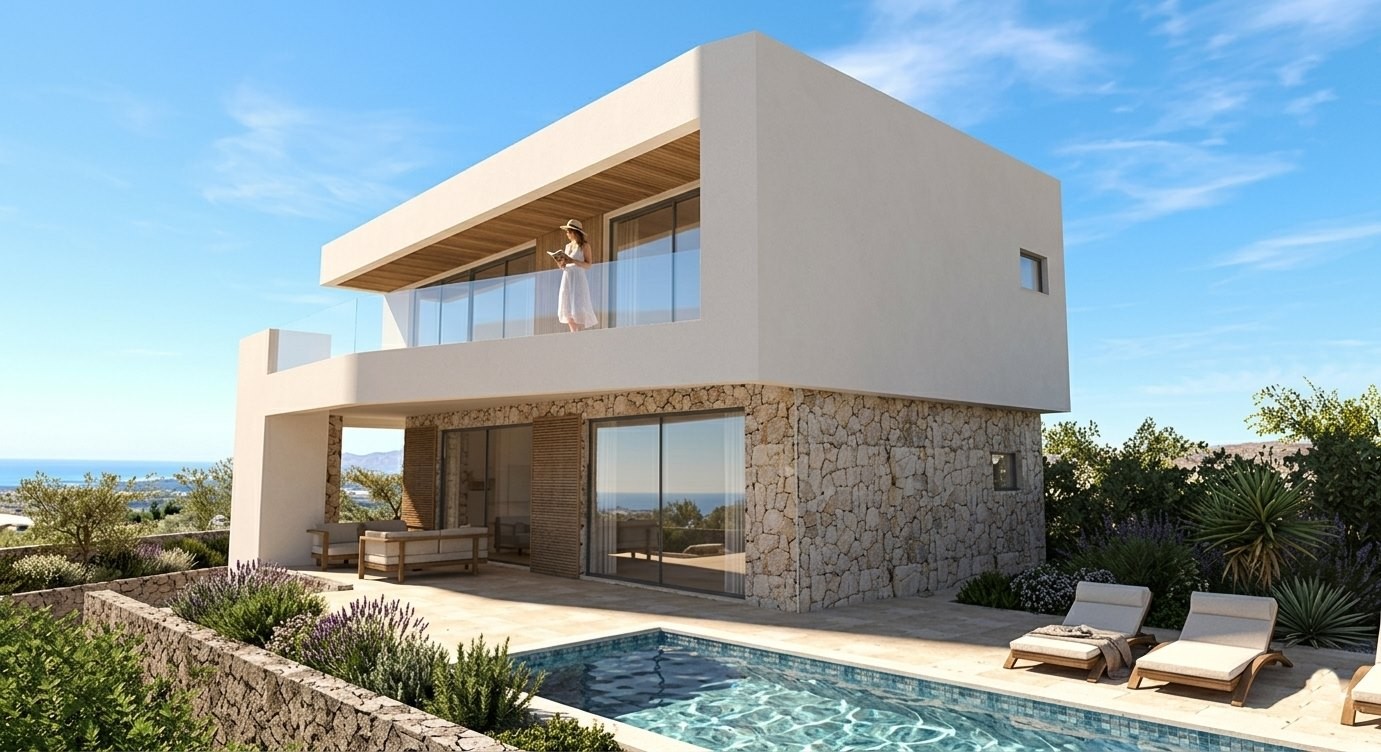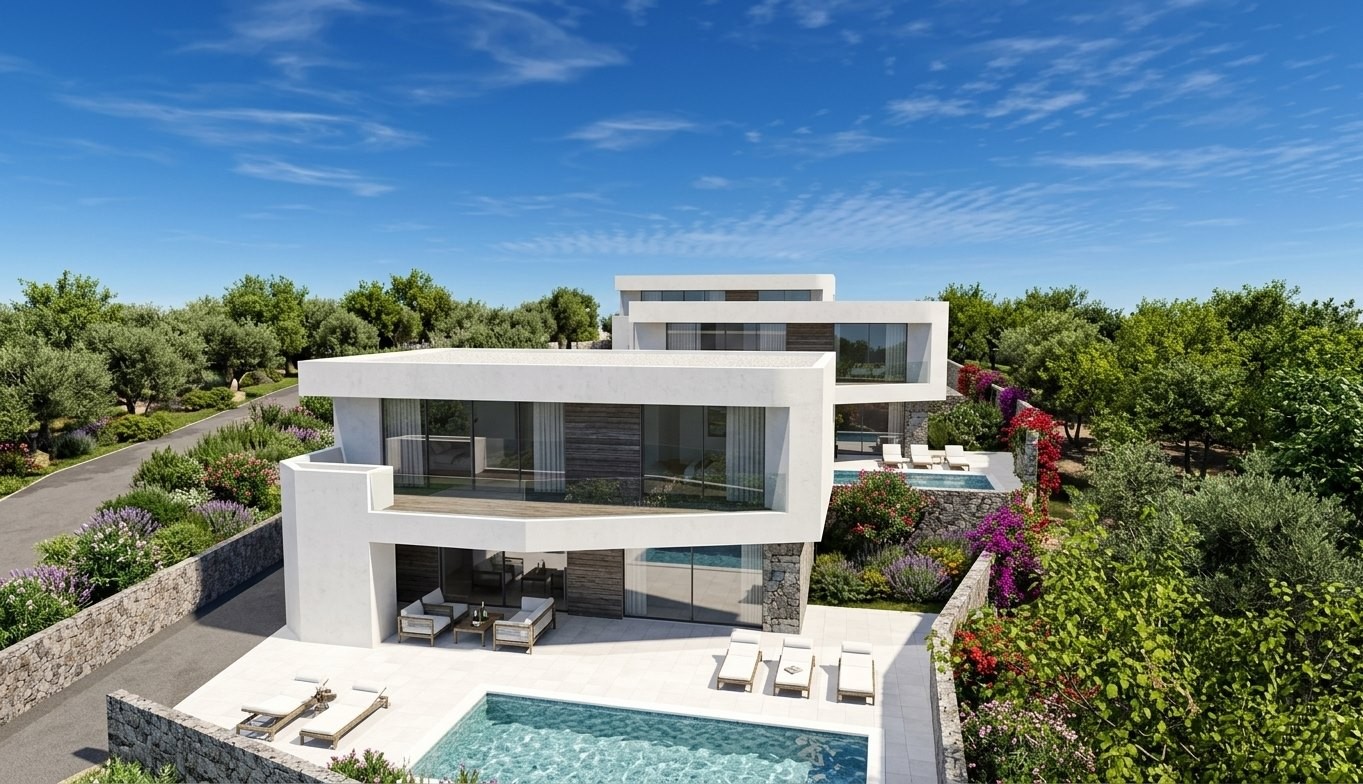 Svaka villa ima 150m2 stanbenog prostora, velike terase, bazen, parking, pogled na more sa prvog kata...
